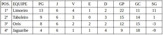 Ambos já estavam classificados para a próxima fase. Com a bola rolando o selecionado limoeirense acabou vencendo pelo placar de 5 a 1 e terminou o Grupo C na liderança com 13 pontos, enquanto que Jaguaribe terminou em 4° lugar com 4 pontos. Veja a classificação completa: